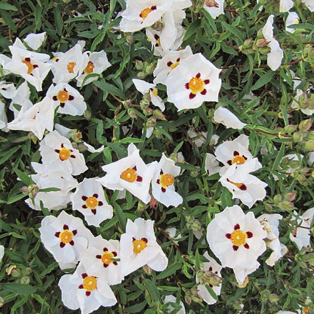 A very popular and distinctive garden plant. Originally from the Mediterranean and North African regions, it has become a favourite among gardeners and landscapers alike and not without good reason. A small evergreen with attractive long thin green leaves that are ideal to set off the mass of white, yellow centred flowers with a beautiful, distinct maroon blotch at the base of each petal, that cover the bush in summer. Of it's many attributes, one is the fact it is among the most drought tolerant plants you can plant in your garden and if you live on thin chalky soil, it will still perform well! Easy to grow in full sun in almost any free draining soil. This plant can be used in a mixed planting or a container. If planting in a pot or other container. Use a good quality compost. Ensure you feed regularly as a hungry plant is a poor performer. We recommend Osmoscote pro 8-9 month applied in the early spring. One application gives all the nutrients the plant requires for the whole year. A few cautionary words. While we describe many plants as drought tolerant, it is not so much that they can survive without water, (some like cactus and succulents can) but more that they have a much greater ability to draw water up from deep down in the ground. This is an important distinction when they are grown in a pot or container, as no matter how good they are at sucking up water, if the pot is dry they have nothing to suck up and will deteriorate and perish just the same as any other plant. So the moral of the story is, you can't plant them in containers thinking they will survive neglect much better than most other plants, because sadly, they won't!