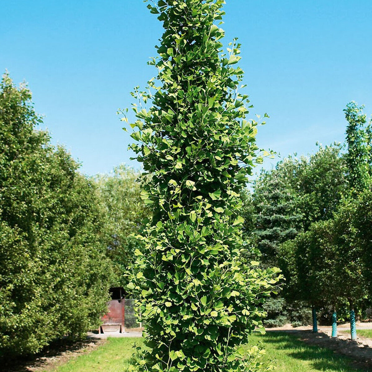 Ginkgo biloba Fastigiata Blagon is a slow growing, French raised, male cultivar, noted for its narrow columnar habit and restricted height. It retains the distinct fan shaped leaves which are an emerald green colour and shimmer and flutter in the wind. In autumn they turn a beautiful bright golden yellow. Ideal for smaller gardens and containers or as a feature plant. Ginkgo are remarkable and beautiful trees, living fossils of great ornamental botanical and geographical interest. The species trees, dating back over 200 million years, have survived unchanged and are the only remaining member of their family. Long believed extinct, until a small surviving population was discovered some 175 years ago in China probably in Zhijiang or Anhui provinces, they are now a very popular tree world wide. Regarded as a sacred tree in the far east, Ginkgo are frequently planted adjacent to Buddhist shrines and are widely used in complementary medicine in many countries. Ginkgos are resistant to most diseases and insect attacks with unusual powers of regeneration, even in older trees, which has undoubtedly been one of the reasons for their remarkable survival. Some trees in China are reputed to be as much as 2500 years old. As one example of the considerable botanical interest they have acquired, Ginkgo trees do not produce pollen as in the more developed higher orders of plant species but instead produce a motile (moving) sperm that have flagellating cilla which carries them to the female receptacle. This is one of the most beautiful of trees. Can be grown in the garden or in a park or estate as a specimen plant. Can also be grown in a pot or other container which will help limit its size. Do not allow it to dry out. Pruning is not generally necessary.